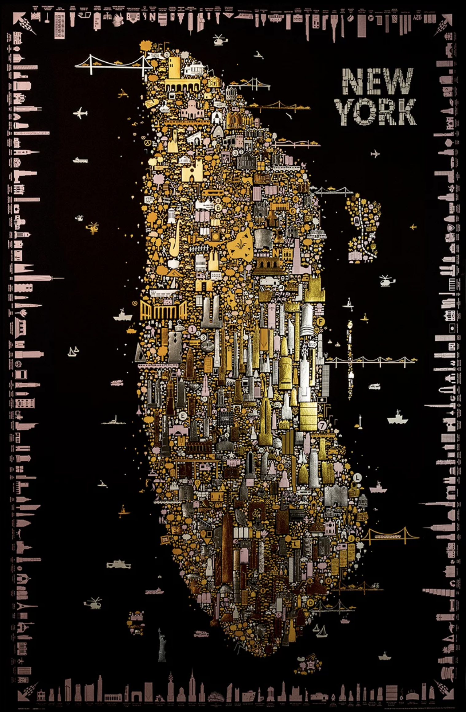 Love this map by artist Rafael Esquer with gold on black velvet.